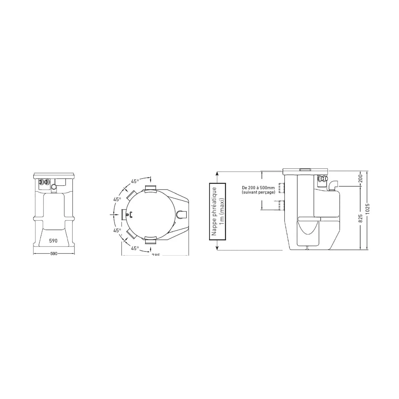 Ainsi, il est possible de raccorder le tuyau entre -200mm et -500mm sous le couvercle et jusqu'à -900mm avec une rehausse. Ce perçage peut être réalisé sur une demie-circonférence ce qui, ajouté à son refoulement orientable, simplifie considérablement la mise en place de la station. Livrée complète avec un pied d'assise et des barres de guidage composite, un clapet-boule, une vanne d'isolement et des manchons passe-câbles, c'est une station dite « prête à poser ».